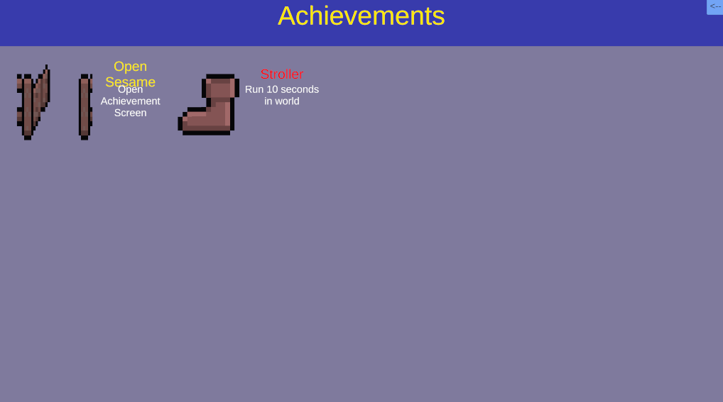 A new achievement scene accessible from the main menu will display the achievements you have unlocked (yellow names) and have yet to unlock (red names).