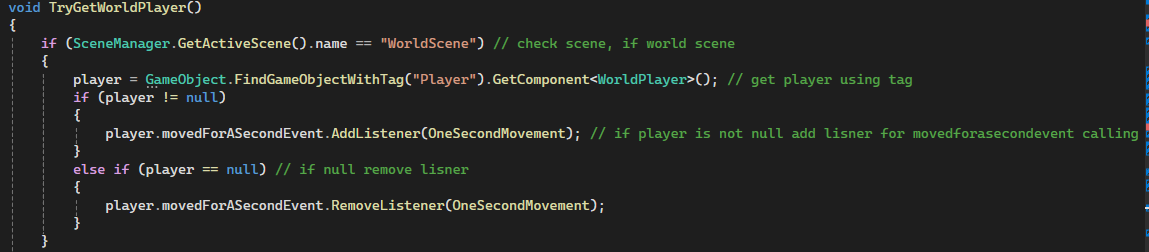 Achievement manager gets a reference to the player while in the world scene and adds a listener to the movedforasecondevent that calls the onesecondmovement function.