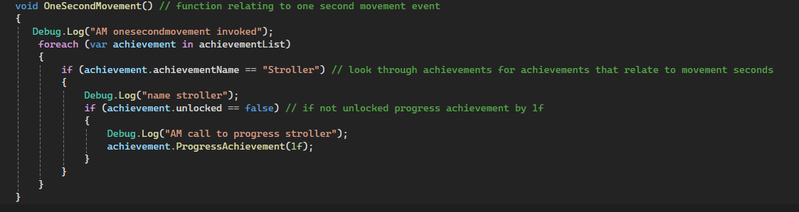 The onesecondmovement function searches through the list of achievements and applies progress to related achievements if they have not yet been unlocked.