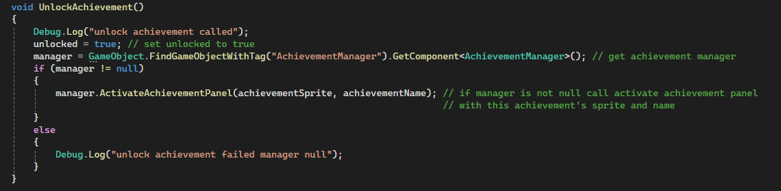 The Unlockachievement function sets the achievement to unlocked true, gets the achievement manager and calls the manager's activateachievmentpanel to display the newly unlocked achievement to the UI panel with the achievements sprite and name.